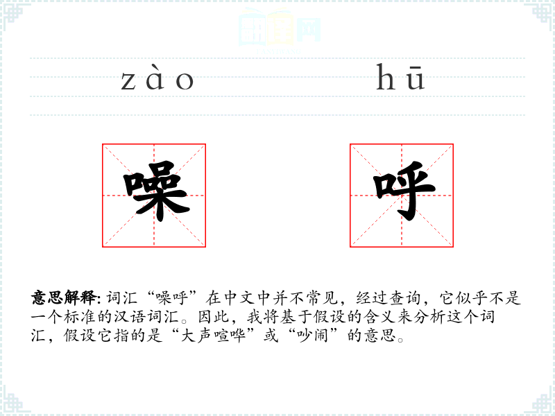 词汇“噪呼”在中文中并不常见,经过查询,它似乎不是一个标准的汉语词汇。因此,我将基于假设的含义来分析这个词汇,假设它指的是“大声喧哗”或“吵闹”的意思。