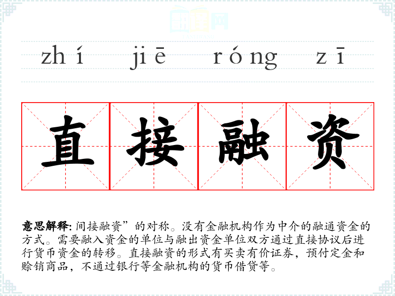 1.间接融资”的对称。没有金融机构作为中介的融通资金的方式。需要融入资金的单位与融出资金单位双方通过直接协议后进行货币资金的转移。直接融资的形式有买卖有价证券,预付定金和赊销商品,不通过银行等金融机构的货币借贷等。