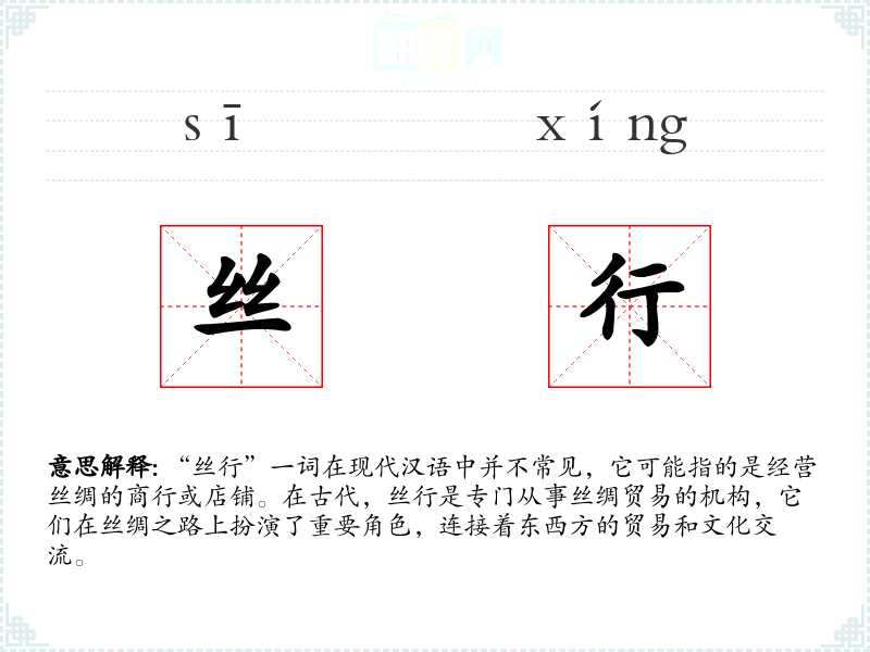 “丝行”一词在现代汉语中并不常见,它可能指的是经营丝绸的商行或店铺。在古代,丝行是专门从事丝绸贸易的机构,它们在丝绸之路上扮演了重要角色,连接着东西方的贸易和文化交流。