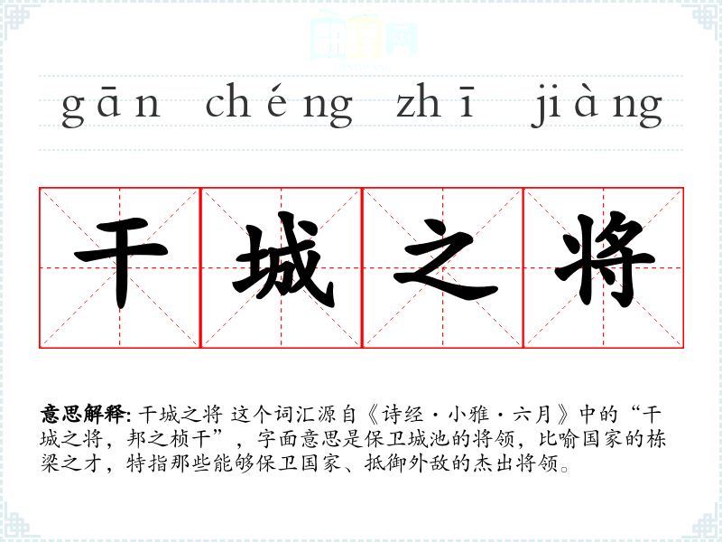 干城之将 这个词汇源自《诗经·小雅·六月》中的“干城之将,邦之桢干”,字面意思是保卫城池的将领,比喻国家的栋梁之才,特指那些能够保卫国家、抵御外敌的杰出将领。