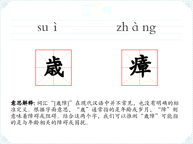 - 词源:“歳”源自古代对时间的计量,“障”则源自障碍的意思。