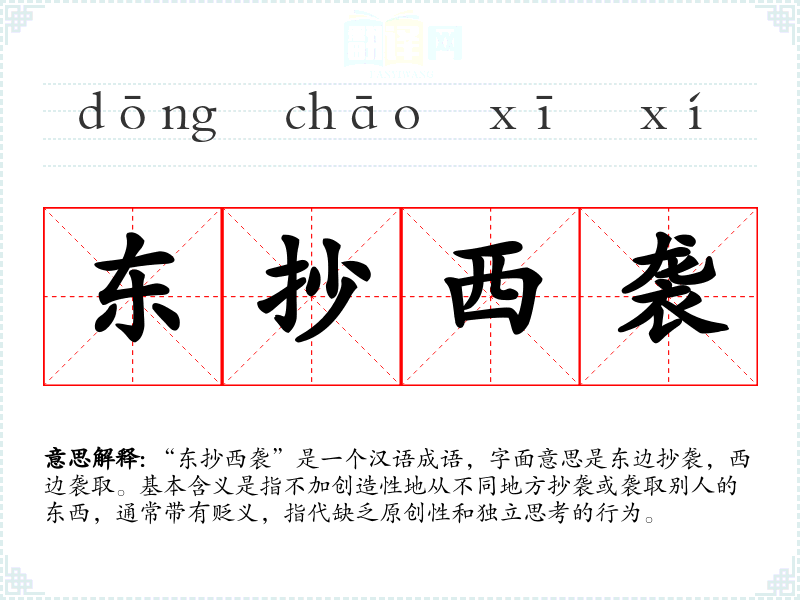 “东抄西袭”是一个汉语成语,字面意思是东边抄袭,西边袭取。基本含义是指不加创造性地从不同地方抄袭或袭取别人的东西,通常带有贬义,指代缺乏原创性和独立思考的行为。