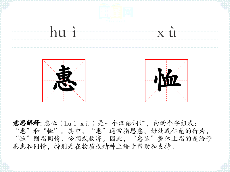 惠恤(huì xù)是一个汉语词汇,由两个字组成:“惠”和“恤”。其中,“惠”通常指恩惠、好处或仁慈的行为,“恤”则指同情、怜悯或救济。因此,“惠恤”整体上指的是给予恩惠和同情,特别是在物质或精神上给予帮助和支持。