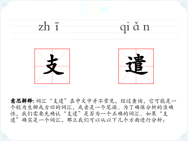 词汇“支遣”在中文中并不常见,经过查询,它可能是一个较为生僻或古旧的词汇,或者是一个笔误。为了确保分析的准确性,我们需要先确认“支遣”是否为一个正确的词汇。如果“支遣”确实是一个词汇,那么我们可以从以下几个方面进行分析: