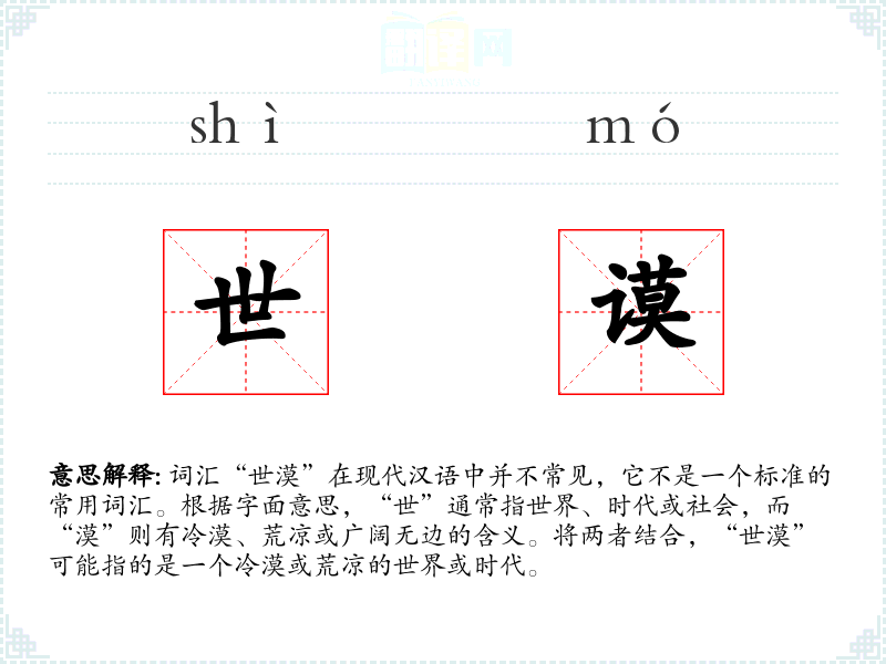 词汇“世漠”在现代汉语中并不常见,它不是一个标准的常用词汇。根据字面意思,“世”通常指世界、时代或社会,而“漠”则有冷漠、荒凉或广阔无边的含义。将两者结合,“世漠”可能指的是一个冷漠或荒凉的世界或时代。
