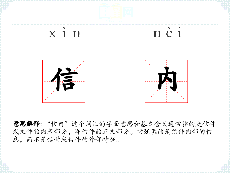“信内”这个词汇的字面意思和基本含义通常指的是信件或文件的内容部分,即信件的正文部分。它强调的是信件内部的信息,而不是信封或信件的外部特征。