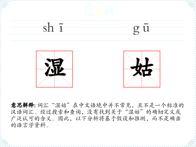 词汇“湿姑”在中文语境中并不常见,且不是一个标准的汉语词汇。经过搜索和查询,没有找到关于“湿姑”的确切定义或广泛认可的含义。因此,以下分析将基于假设和推测,而不是确凿的语言学资料。