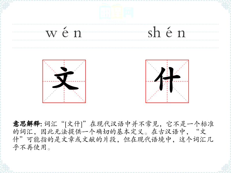 词汇“[文什]”在现代汉语中并不常见,它不是一个标准的词汇,因此无法提供一个确切的基本定义。在古汉语中,“文什”可能指的是文章或文献的片段,但在现代语境中,这个词汇几乎不再使用。
