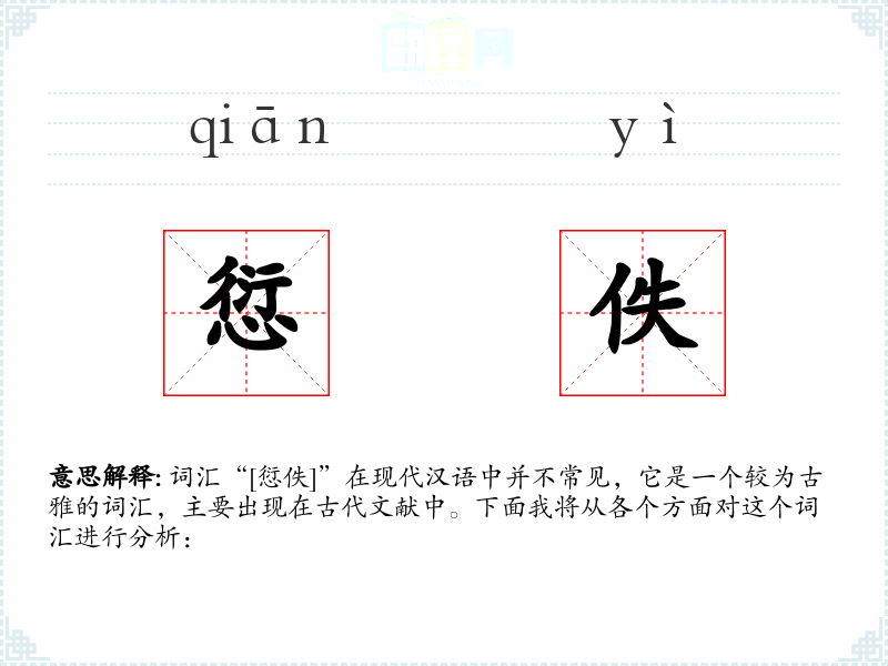 词汇“[愆佚]”在现代汉语中并不常见,它是一个较为古雅的词汇,主要出现在古代文献中。下面我将从各个方面对这个词汇进行分析: