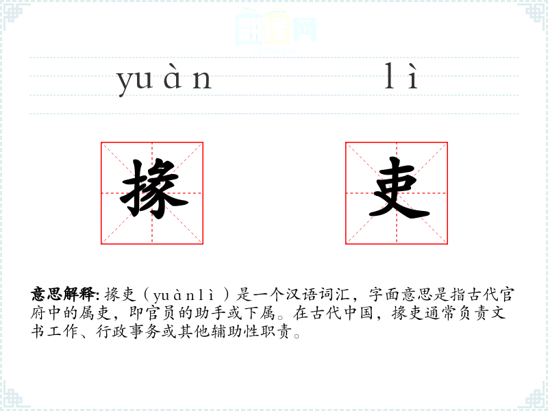 掾吏一词源自古代汉语,其中“掾”字原指辅助、协助的意思,“吏”则指官员或公务员。随着时间的推移,这个词的含义逐渐固定为指代官府中的下属官员。