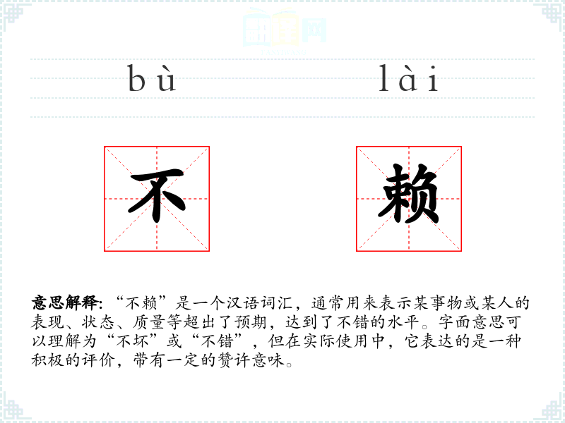 “不赖”是一个汉语词汇,通常用来表示某事物或某人的表现、状态、质量等超出了预期,达到了不错的水平。字面意思可以理解为“不坏”或“不错”,但在实际使用中,它表达的是一种积极的评价,带有一定的赞许意味。