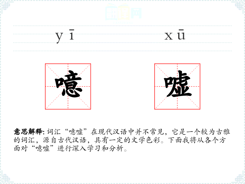 词汇“噫嘘”在现代汉语中并不常见,它是一个较为古雅的词汇,源自古代汉语,具有一定的文学色彩。下面我将从各个方面对“噫嘘”进行深入学习和分析。