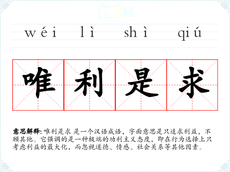 唯利是求 是一个汉语成语,字面意思是只追求利益,不顾其他。它强调的是一种极端的功利主义态度,即在行为选择上只考虑利益的最大化,而忽视道德、情感、社会关系等其他因素。
