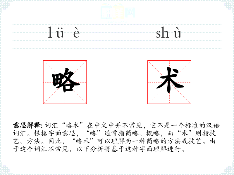 词汇“略术”在中文中并不常见,它不是一个标准的汉语词汇。根据字面意思,“略”通常指简略、概略,而“术”则指技艺、方法。因此,“略术”可以理解为一种简略的方法或技艺。由于这个词汇不常见,以下分析将基于这种字面理解进行。