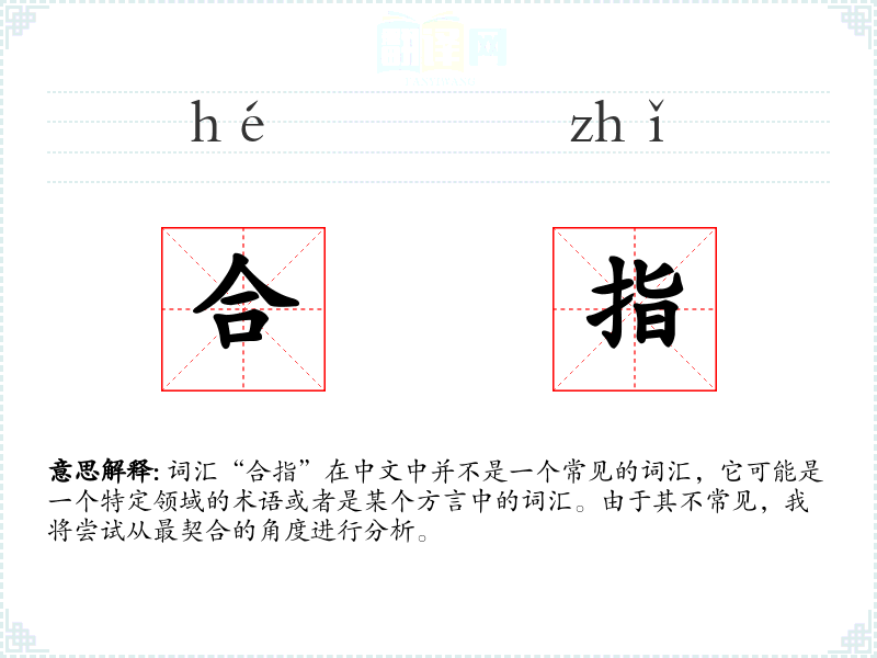 由于“合指”不是一个标准词汇,对其的理解可能需要结合具体语境。在语言学*和表达中,了解特定领域或方言中的词汇是非常重要的,这有助于更深入地理解语言的多样性和丰富性。