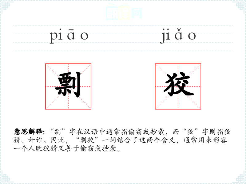 “剽”字在汉语中通常指偷窃或抄袭,而“狡”字则指狡猾、奸诈。因此,“剽狡”一词结合了这两个含义,通常用来形容一个人既狡猾又善于偷窃或抄袭。