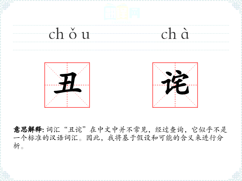 词汇“丑诧”在中文中并不常见,经过查询,它似乎不是一个标准的汉语词汇。因此,我将基于假设和可能的含义来进行分析。