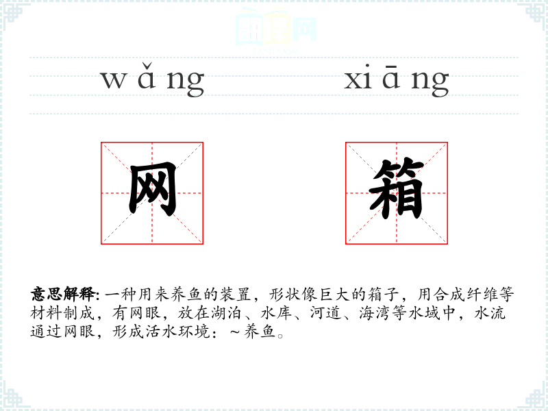 一种用来养鱼的装置,形状像巨大的箱子,用合成纤维等材料制成,有网眼,放在湖泊、水库、河道、海湾等水域中,水流通过网眼,形成活水环境:~养鱼。