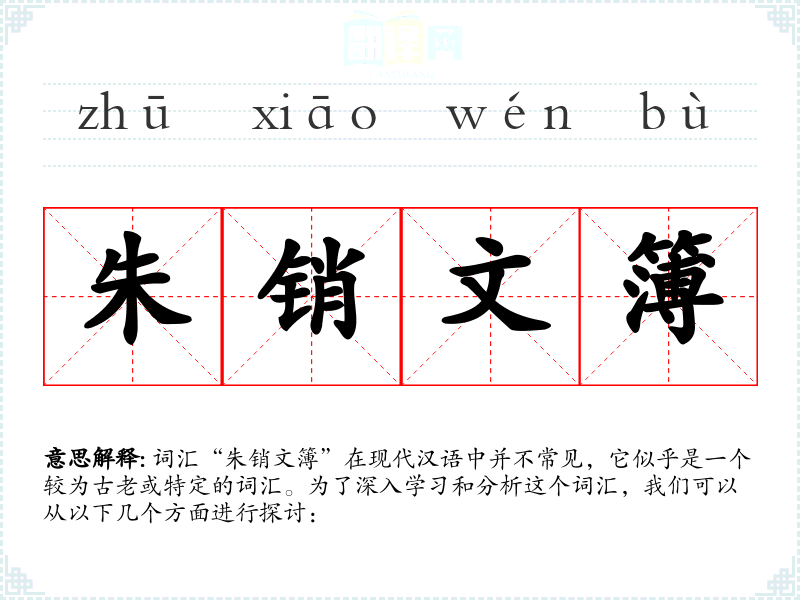 词汇“朱销文簿”在现代汉语中并不常见,它似乎是一个较为古老或特定的词汇。为了深入学*和分析这个词汇,我们可以从以下几个方面进行探讨: