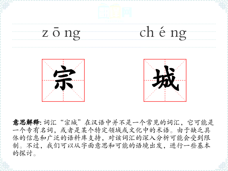 词汇“宗城”在汉语中并不是一个常见的词汇,它可能是一个专有名词,或者是某个特定领域或文化中的术语。由于缺乏具体的信息和广泛的语料库支持,对该词汇的深入分析可能会受到限制。不过,我们可以从字面意思和可能的语境出发,进行一些基本的探讨。