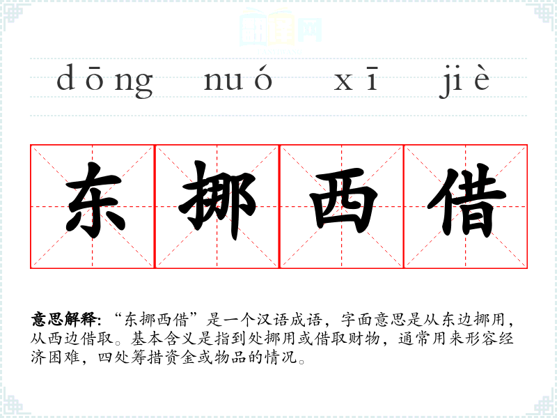 “东挪西借”是一个汉语成语,字面意思是从东边挪用,从西边借取。基本含义是指到处挪用或借取财物,通常用来形容经济困难,四处筹措资金或物品的情况。