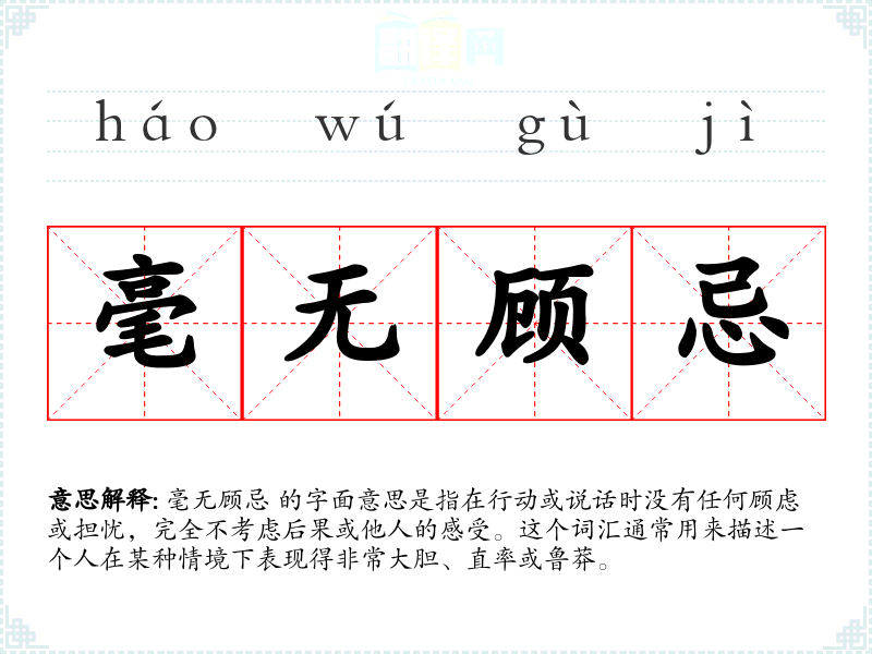 毫无顾忌 的字面意思是指在行动或说话时没有任何顾虑或担忧,完全不考虑后果或他人的感受。这个词汇通常用来描述一个人在某种情境下表现得非常大胆、直率或鲁莽。