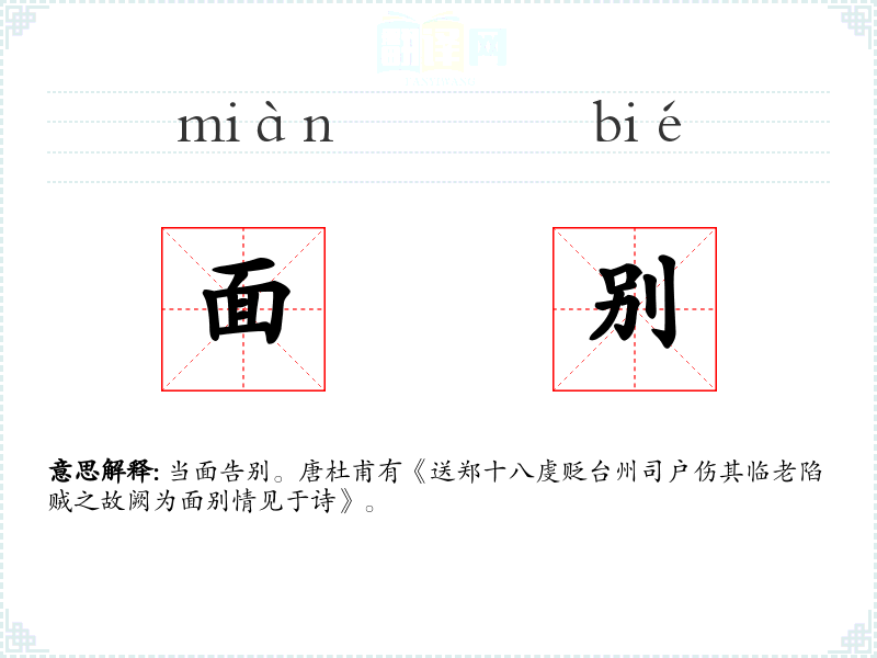 当面告别。唐杜甫有《送郑十八虔贬台州司户伤其临老陷贼之故阙为面别情见于诗》。