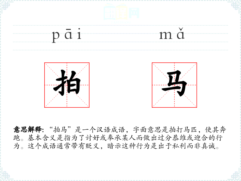 “拍马”是一个汉语成语,字面意思是拍打马匹,使其奔跑。基本含义是指为了讨好或奉承某人而做出过分恭维或迎合的行为。这个成语通常带有贬义,暗示这种行为是出于私利而非真诚。