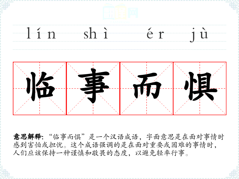 “临事而惧”是一个汉语成语,字面意思是在面对事情时感到害怕或担忧。这个成语强调的是在面对重要或困难的事情时,人们应该保持一种谨慎和敬畏的态度,以避免轻率行事。