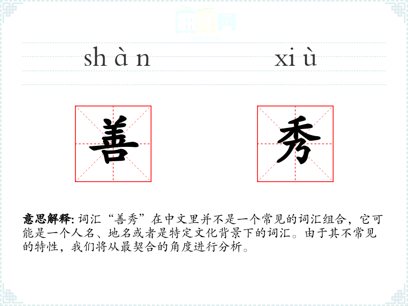 “善”通常指善良、好的意思,而“秀”可以指优秀、出色或者是展示、表演的意思。结合起来,“善秀”可能指的是善良且出色的人或事物。