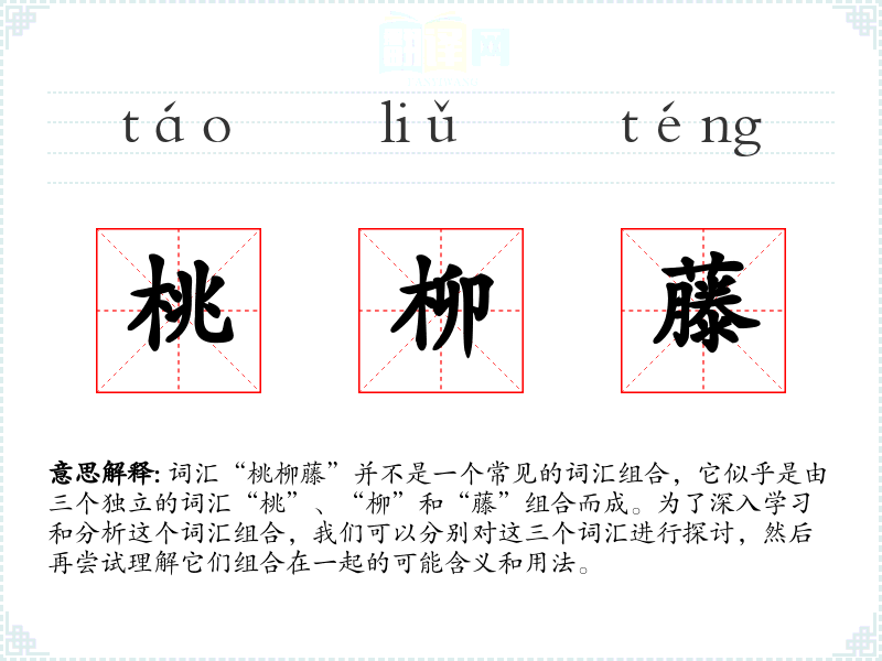 通过对“桃柳藤”这个词汇组合的分析,我们可以看到每个词汇都有其独特的文化内涵和情感联想。将它们组合在一起,可以创造出丰富的意象和故事。在语言学*和表达中,理解和运用这样的词汇组合,可以增强语言的表达力和创造力。