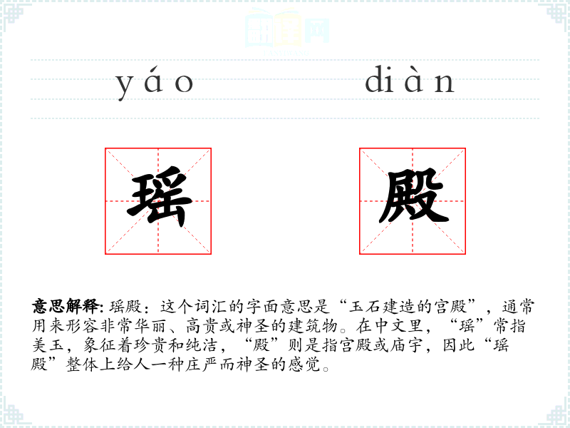 瑶殿:这个词汇的字面意思是“玉石建造的宫殿”,通常用来形容非常华丽、高贵或神圣的建筑物。在中文里,“瑶”常指美玉,象征着珍贵和纯洁,“殿”则是指宫殿或庙宇,因此“瑶殿”整体上给人一种庄严而神圣的感觉。