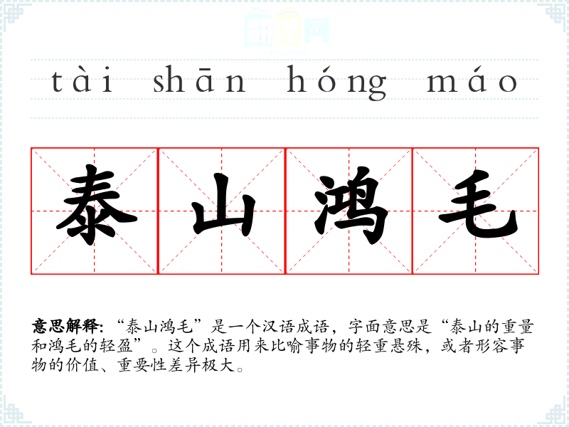 “泰山鸿毛”是一个汉语成语,字面意思是“泰山的重量和鸿毛的轻盈”。这个成语用来比喻事物的轻重悬殊,或者形容事物的价值、重要性差异极大。