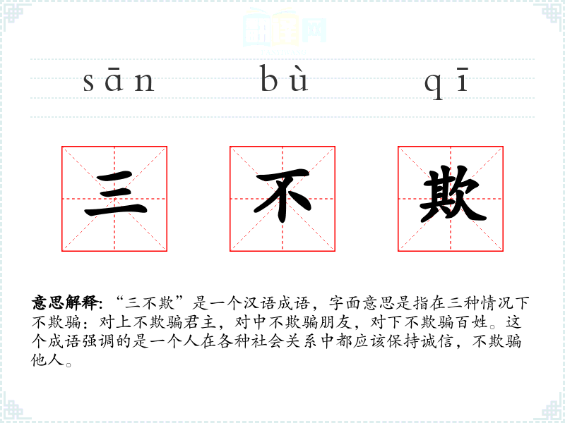 “三不欺”是一个汉语成语,字面意思是指在三种情况下不欺骗:对上不欺骗君主,对中不欺骗朋友,对下不欺骗百姓。这个成语强调的是一个人在各种社会关系中都应该保持诚信,不欺骗他人。