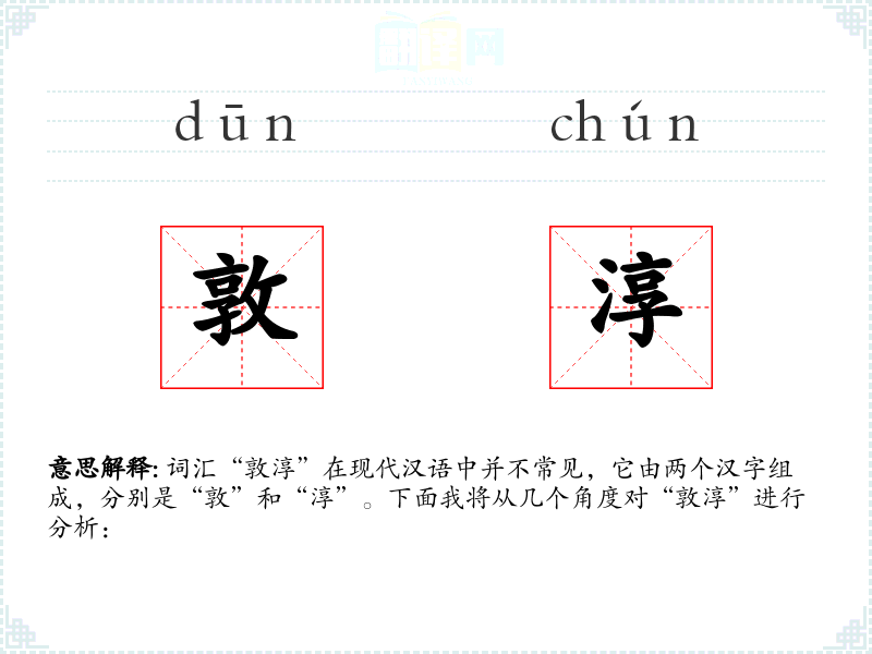 词汇“敦淳”在现代汉语中并不常见,它由两个汉字组成,分别是“敦”和“淳”。下面我将从几个角度对“敦淳”进行分析: