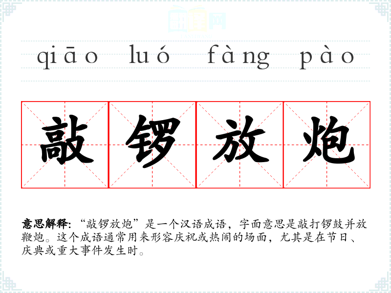 “敲锣放炮”是一个汉语成语,字面意思是敲打锣鼓并放鞭炮。这个成语通常用来形容庆祝或热闹的场面,尤其是在节日、庆典或重大**发生时。