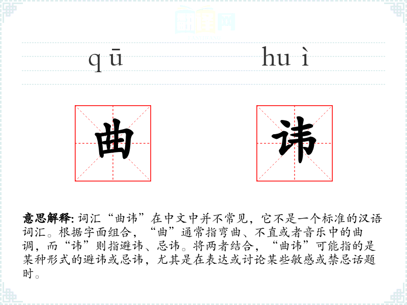 由于“曲讳”不是一个常用词汇,其词源和演变不详。它可能是由“曲”和“讳”两个字组合而成,用以描述一种特定的表达方式。