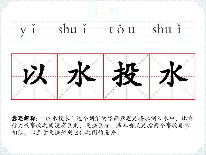 “以水投水”这个词汇的字面意思是将水倒入水中,比喻行为或事物之间没有区别,无法区分。基本含义是指两个事物非常相似,以至于无法辨别它们之间的差异。
