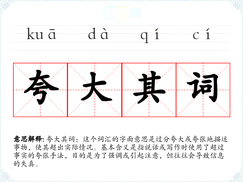夸大其词:这个词汇的字面意思是过分夸大或夸张地描述事物,使其超出实际情况。基本含义是指说话或写作时使用了超过事实的夸张手法,目的是为了强调或引起注意,但往往会导致信息的失真。