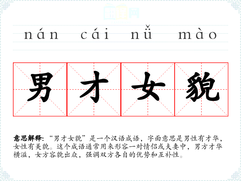 “男才女貌”是一个汉语成语,字面意思是男性有才华,女性有美貌。这个成语通常用来形容一对情侣或夫妻中,男方才华横溢,女方容貌出众,强调双方各自的优势和互补性。