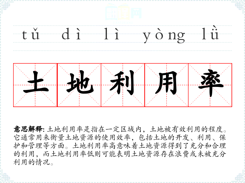 同义词:土地使用效率、土地开发率、土地资源利用率。 反义词:土地闲置率、土地浪费率。