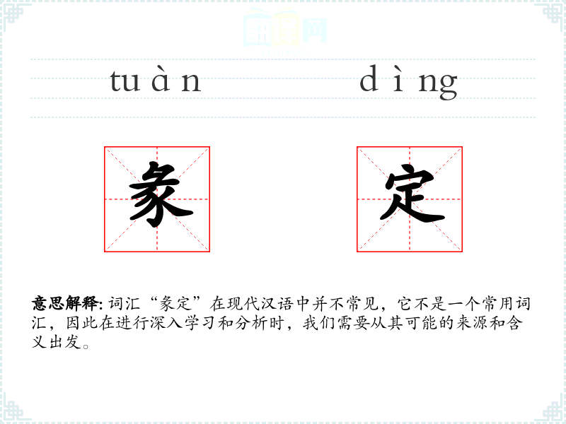 词汇“彖定”在现代汉语中并不常见,它不是一个常用词汇,因此在进行深入学*和分析时,我们需要从其可能的来源和含义出发。