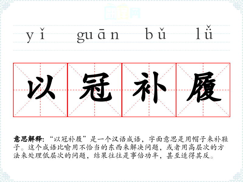 “以冠补履”是一个汉语成语,字面意思是用帽子来补鞋子。这个成语比喻用不恰当的东西来解决问题,或者用高层次的方法来处理低层次的问题,结果往往是事倍功半,甚至适得其反。