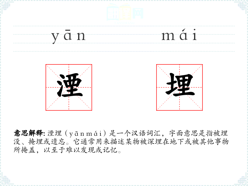 湮埋(yān mái)是一个汉语词汇,字面意思是指被埋没、掩埋或遗忘。它通常用来描述某物被深埋在地下或被其他事物所掩盖,以至于难以发现或记忆。