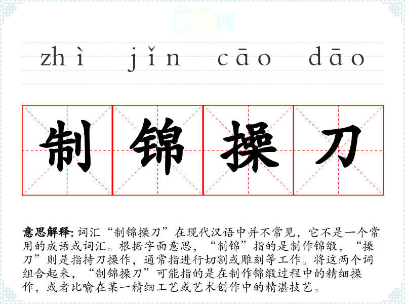 由于“制锦操刀”不是一个常用词汇,其词源和历史演变不详。它可能是由“制锦”和“操刀”两个词组合而成,用以形容精细的工艺操作。