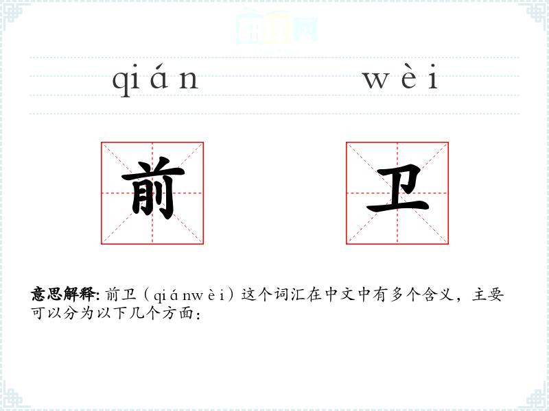 前卫(qiánwèi)这个词汇在中文中有多个含义,主要可以分为以下几个方面: