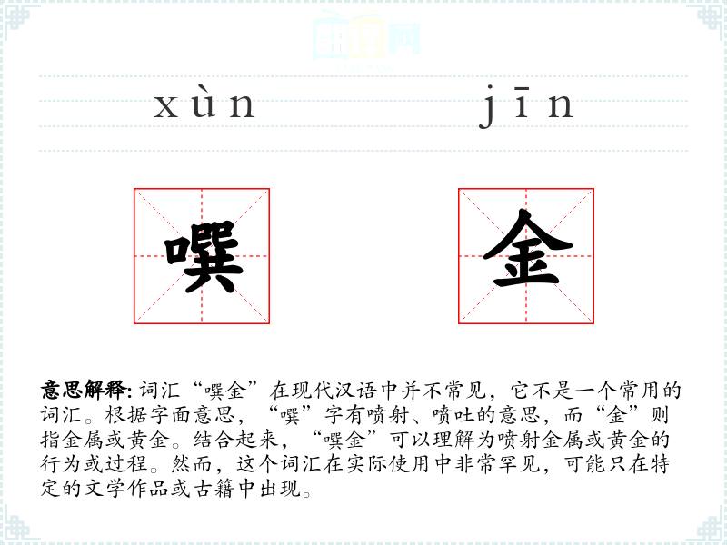 - 理解:“噀金”是一个非常罕见的词汇,主要在古代文学或神话传说中出现,代表着神秘和超自然的力量。