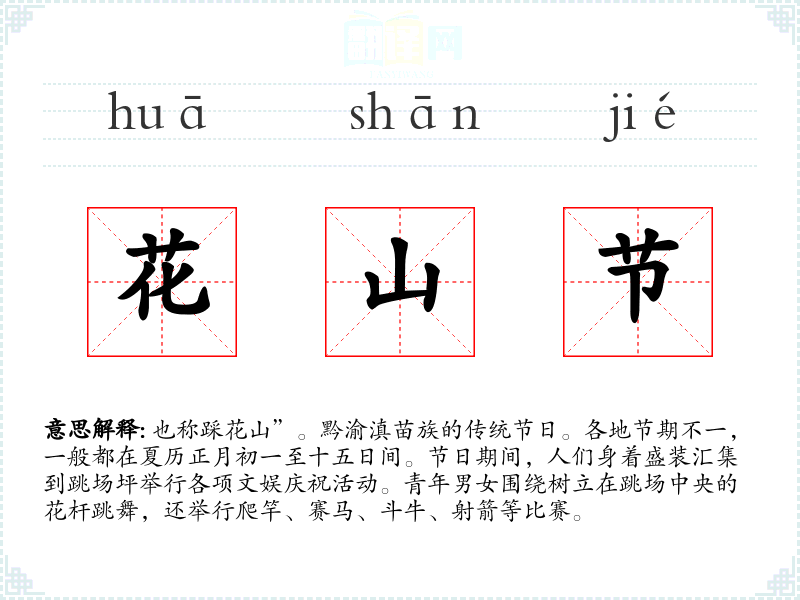 1.也称踩花山”。黔渝滇苗族的传统节日。各地节期不一,一般都在夏历正月初一至十五日间。节日期间,人们身着盛装汇集到跳场坪举行各项文娱庆祝活动。青年男女围绕树立在跳场中央的花杆跳舞,还举行爬竿、赛马、斗牛、射箭等比赛。