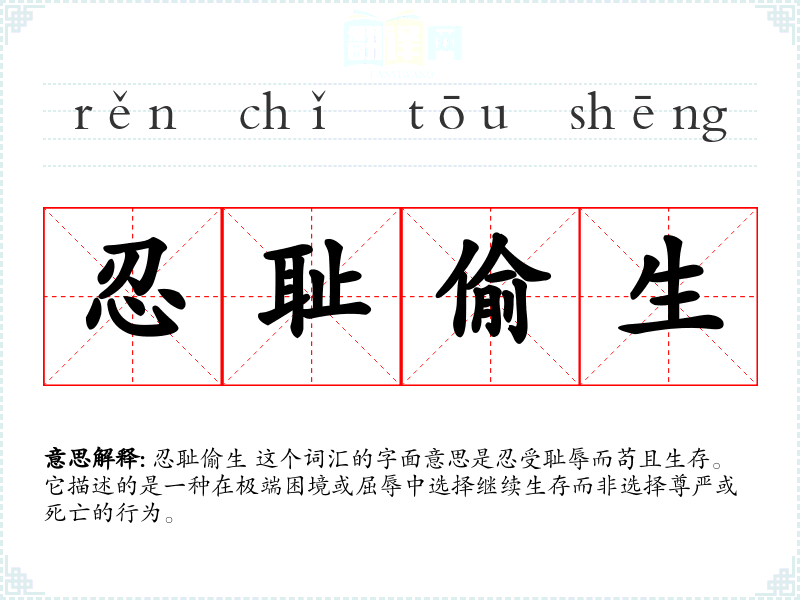 忍耻偷生 这个词汇的字面意思是忍受耻辱而苟且生存。它描述的是一种在极端困境或屈辱中选择继续生存而非选择尊严或死亡的行为。