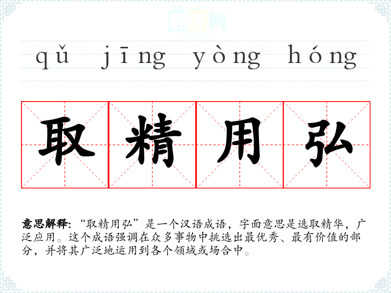 “取精用弘”是一个汉语成语,字面意思是选取精华,广泛应用。这个成语强调在众多事物中挑选出最优秀、最有价值的部分,并将其广泛地运用到各个领域或场合中。